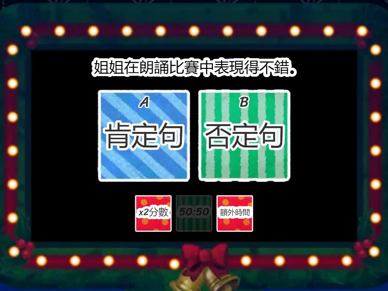 1) 姐姐在朗誦比賽中表現得不錯。 a) 肯定句 b) 否定句 2) 這個巧克力蛋糕很難吃。 a) 肯定句 b) 否定句 3) 爸爸不反對這件事。 a) 肯定句 b) 否定句 4) 媽媽禁止我們深夜外出,以免遇到危險。 a) 肯定句 b) 否定句 5) 這道算術題十分複雜。 a) 肯定句 b) 否定句 6) 火車的班次不變,方便乘客計劃行程。 a) 肯定句 b) 否定句 7) 哥哥膽子不小,怎麼會怕這小老鼠呢? a) 肯定句 b) 否定句 8) 這項工作很輕鬆,我只花了半天就完成了。 a) 肯定句 b) 否定句