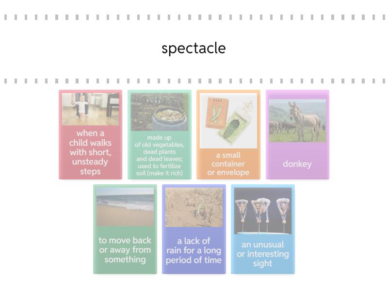an unusual or interesting sight - spectacle , when a child walks with short, unsteady steps - toddles, a small container or envelope - packet, to move back or away from something - retreat, donkey - burro, a lack of rain for a long period of time - drought, made up of old vegetables, dead plants and dead leaves; used to fertilize soil (make it rich) - compost,