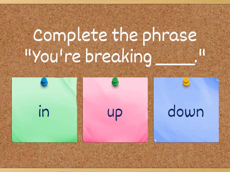 1) Complete the phrase "You're breaking ____." a) in b) up c) down 2) Complete the question "Could you speak _____?" a) up b) down c) high 3) Complete the phrase "Sorry, I keep losing the ________." a) sign b) signal c) internet 4) Complete the question "Could you ________ that, please?" a) say b) tell c) repeat