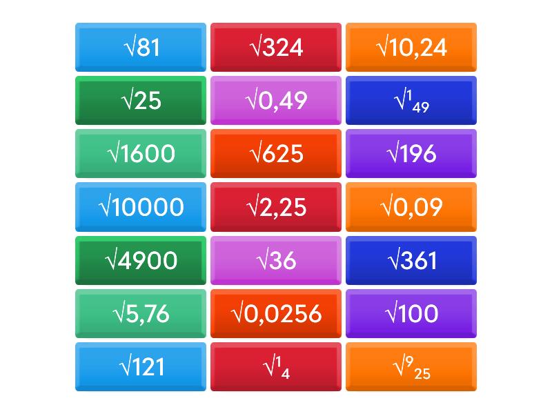 √25 - 5, √0,49 - 0,7, √81 - 9, √2,25 - 1,5, √324 - 18, √4900 - 70, √10000 - 100, √0,09 - 0,3, √925 - 35, √14 - 12, √196 - 14, √0,0256 - 0,16, √5,76 - 2,4, √1600 - 40, √625 - 25, √121 - 11, √36 - 6, √149 - 17, √100 - 10, √361 - 19, √10,24 - 3,2,