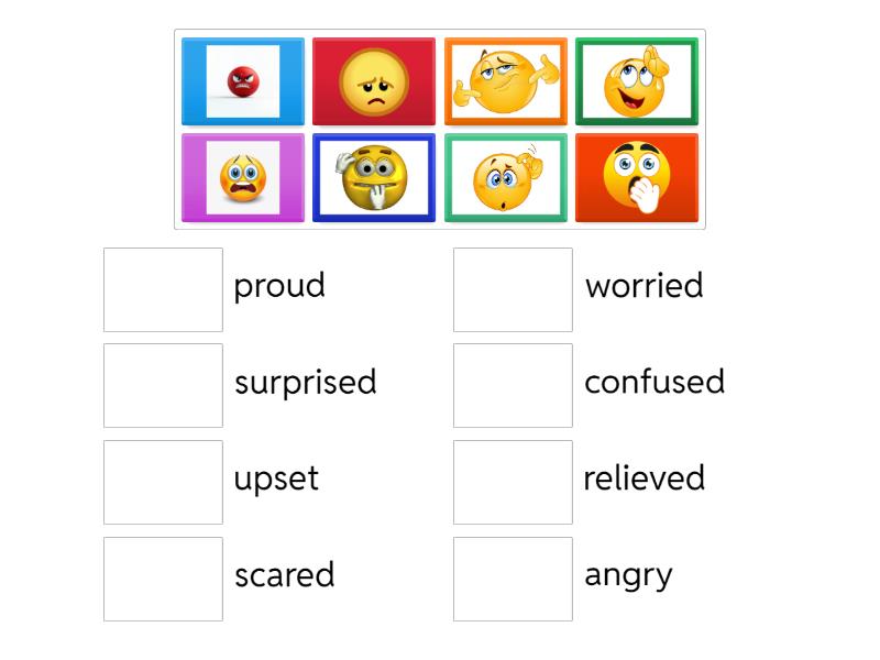 upset, angry, surprised, confused, proud, relieved, worried, scared,