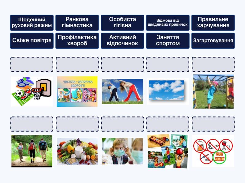 Ранкова гімнастика, Правильне харчування, Свіже повітря, Заняття спортом, Відмова від шкідливих привичок, Особиста гігієна, Загартовування, Активний відпочинок, Профілактика хвороб, Щоденний руховий режим,