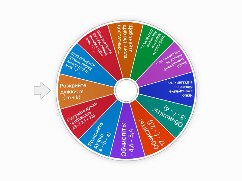 1) Щоб розкрити дужки, перед якими стоїть знак "+" ... 2) Щоб розкрити дужки, перед якими стоїть знак "-" ... 3) Щоб знайти дріб від числа достатньо ... 4) Щоб знайти відсотки від числа достатньо ... 5) Якщо зменшуване більше за від'ємник, то ... 6) Якщо зменшуване більше за від'ємник, то ... 7) Обчисліть: -3 - ( - 4) 8) Обчисліть: 17 - ( - 2,1) 9) Обчисліть: - 4,6 - 5,4 10) Розкрийте дужки:  a - (b - 4) 11) Розкрийте дужки та обчисліть:  7,3 - ( 3,5 + 7,3) 12) Розкрийте дужки: m - ( m + k)