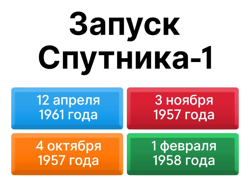 1) Запуск Спутника-1 a) 12 апреля 1961 года b) 3 ноября 1957 года c) 4 октября 1957 года d) 1 февраля 1958 года 2) Станция "Луна-2" a) Первый искусственный спутник Земли b) Первое животное в космосе c) Первый американский спутник d) Впервые достигла поверхности Луны 3) На каком спутнике была запущена в космос собака Лайка? a) Спутник-2 b) Эксплорер-1 c) Спутник-5 d) Авангард-1 4) Первый американский спутник, удачно выведенный на орбиту? a) Дискаверер-13 b) Эксплорер-1 c) Авангард-1 d) Телстар 5) Результат запуска космического корабля "Спутник-5" с собаками Белкой и Стрелкой на борту? a) Белка и Стрелка благополучно вернулись на Землю b) Космический корабль потерпел крушение на Земле c) Белка и стрелка не вернулись на Землю, стали символами советской космической программы 6) первый полёт человеком в космос был совершен... a) 7 августа 1961 г. b) 12 апреля 1960 г. c) 12 апреля 1961 г. d) 12 августа 1961 г. 7) Первый полет человека в космос был совершен на корабле... a) Восток-1 b) Восток-3 c) Спутник-3 d) Восход 8) Как звали первую женщину в космосе? a) Валентина Терешкова b) Людмила Гурченко c) Александра Коллонтай d) Зоя Космодемьянская 9) Какова была цель программы "Меркурий"? a) Посадка на поверхность луны b) Изучить космическую атмосферу c) Догнать СССР в космических достижениях d) Управление научно-технической политики 10) Как звали человека, который первым ступил на луну? a) Нил Армстронг b) Вернер фон Браун c) Базз Олдрин d) Майкл Коллинз