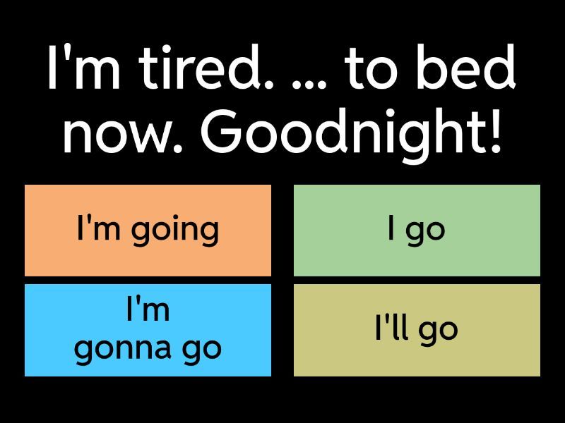 1) I'm tired. ... to bed now. Goodnight! a) I'm going b) I go c) I'm gonna go d) I'll go 2) ... anything tonight, so we can go out somewhere. a) I'm not doing b) I don't do c) I won't do d) I'm doing 3) That bag looks heavy. ... you with it. a) I'll help b) I'm helping c) I help d) I'm going to help 4) I think the weather ... nice later. a) will be b) is c) is going to be d) is being 5) 'Anna is in hospital.' 'Yes, I know. ... her this evening.' a) I'm going to visit b) I'll visit c) I visit d) I'm visiting 6) 'Anna is in hospital.' 'Oh my goodness, then ... her this evening. Thank you for telling me!' a) I'll visit b) I'm going to visit c) I'm visiting d) I visit 7) 'I can't open this bottle.' 'Give it to me, ... it.' a) I'll open b) I'm going to open c) I'm opening d) I open 8) 'Are you free tomorrow afternoon?' 'No, unfortunately, ...' a) I'm working b) I work c) I'll work d) I'm not working 9) 'What time is the movie tonight?' 'It ... at 8.' a) starts b) is starting c) is going to start d) will start 10) 'Don't be late.' 'I ... to be there on time.' a) will try b) am trying c) am going to try d) try 11) 'You can trust me. I ... anyone what you just told me.' a) won't tell b) 'm not telling c) 'll tell d) 'm telling 12) I think the birth rate ... in the next few years. a) will go down b) is going to go down c) is going down 13) We ... next month! (they've booked the place) a) 'll get married b) 're getting married 14) 'Look at those black clouds! I think it ... .' (we can see some black clouds) a) 'll rain b) 's going to rain c) 's raining d) rains 15) 'How long ... to put up with this?' a) are you going b) you are going c) will you d) you will