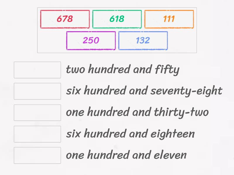 132 - one hundred and thirty-two, 111 - one hundred and eleven, 250 - two hundred and fifty, 678 - six hundred and seventy-eight, 618 - six hundred and eighteen,