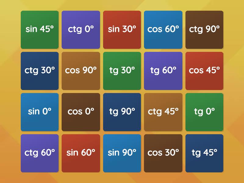 sin 30° - 1/2, sin 60° - √3/2, sin 45° - √2/2, sin 0° - 0, sin 90° - 1, cos 30° - √3/2, cos 60° - 1/2, cos 45° - √2/2, cos 0° - 1, cos 90º - 0, tg 0° - 0, tg 30° - √3/3, tg 45° - 1, tg 60° - √3, tg 90° - -, ctg 0° - -, ctg 30° - √3, ctg 60° - √3/3, ctg 45° - 1, ctg 90° - 0,