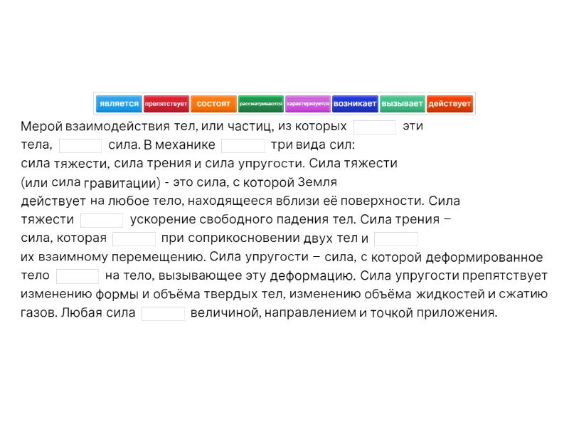 Мерой взаимодействия тел, или частиц, из которых ____ эти тела, ____ сила. В механике ____ три вида сил: сила тяжести, сила трения и сила упругости. Сила тяжести (или сила гравитации) - это сила, с которой Земля действует на любое тело, находящееся вблизи её поверхности. Сила тяжести ____ ускорение свободного падения тел. Сила трения – сила, которая ____ при соприкосновении двух тел и ____ их взаимному перемещению. Сила упругости – сила, с которой деформированное тело ____ на тело, вызывающее эту деформацию. Сила упругости препятствует изменению формы и объёма твердых тел, изменению объёма жидкостей и сжатию газов. Любая сила ____ величиной, направлением и точкой приложения.