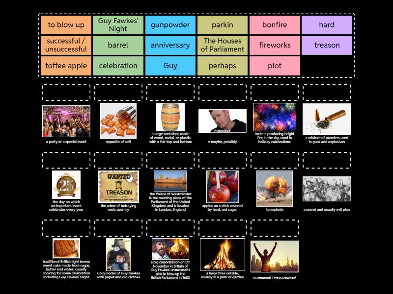 Guy Fawkes' Night - a big celebratation on 5th November in Britain of Guy Fawkes' unsuccessful plot to blow up the British Parliament in 1605, celebration - a party or a special event, anniversary - the day on which an important event celebrates every year, successful / unsuccessful - успешный / неуспешный, plot - a secret and usually evil plan, treason - the crime of betraying one's country, to blow up - to explode, bonfire - a large fires outside, usually in a park or garden, fireworks - rockets producing bright fire in the sky, used in holiday celebrations, Guy - a big model of Guy Fawkes with papet and old clothes, parkin - traditional British light brown sweet cake made from sugar, butter and water; usually cooking for some celebration including Guy Fawkes' Night, toffee apple - apples on a stick covered by hard, red sugar, hard - opposite of soft, perhaps - = maybe, possibly, gunpowder - a mixture of powders used in guns and explosives, barrel - a large container, made of wood, metal, or plastic, with a flat top and bottom, The Houses of Parliament - the Palace of Westminster is the meeting place of the Parliament of the United Kingdom and is located in London, England,