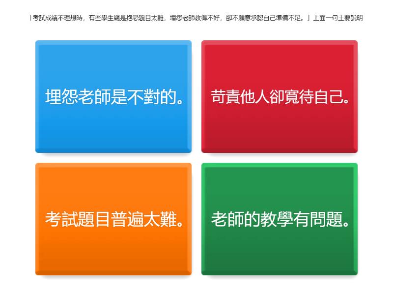 1) 「考試成績不理想時,有些學生總是抱怨題目太難,埋怨老師教得不好,卻不願意承認自己準備不足。」上面一句主要説明 a) 埋怨老師是不對的。 b) 苛責他人卻寬待自己。 c) 考試題目普遍太難。 d) 老師的教學有問題。 2) 「這雙運動鞋無論外觀設計還是功能都相當創新,所以發售當天就被搶購一空,至今仍是暢銷款式。」上面一句主要説明 a) 這雙運動鞋一直很受歡迎。 b) 運動鞋太昂貴。 c) 這雙運動鞋的設計很好。 d) 人們熱衷買名牌。 3) 知名導演陳志華不但拍攝紀錄片關注社會議題,更自掏腰包資助年輕導演,這不是很值得我們尊重嗎?」上面一句主要是 a) 記述陳志華曾資助他人。 b) 讚揚陳志華扶持後輩的精神。 c) 説明陳志華拍片技術好。 d) 認同陳志華是成功導演。 4) 「在比賽落敗後,有些運動員只會抱怨場地條件差,責備裁判判決不公,卻不願意檢視自己落敗的原因。」上面一句主要説明 a) 抱怨裁判是不對。 b) 比賽壓力沉重。 c) 自己比他人專業。 d) 雙重標準的現象。 5) 「這款平板電腦無論外型還是性能都相當出眾,所以上市後持續熱賣,到現在依然供不應求。」上面一句的意思是指 a) 人們依賴電子產品。 b) 電子產品更新太快。 c) 這款平板的設計很好。 d) 這款平板一直很受歡迎。 6) 「知名企業家王大明不但經常資助貧困學生完成學業,更親自到學校分享創業經驗,這不是很值得我們學習嗎?」上面一句主要 a) 讚揚王大明樂於助人的精神。 b) 記述王大明曾到學校演講。 c) 説明王大明很富有。 d) 認同王大明是成功企業家。 7) 「這間新開的餐廳不論是環境裝潢還是菜式,都別具特色,所以開業至今一直座無虛席,預約更要排到下個月。」上面一句主要説明 a) 這間餐廳的設計很好。 b) 這間餐廳一直很受歡迎。 c) 餐廳應該增加座位。 d) 人們喜歡嘗試新餐廳。