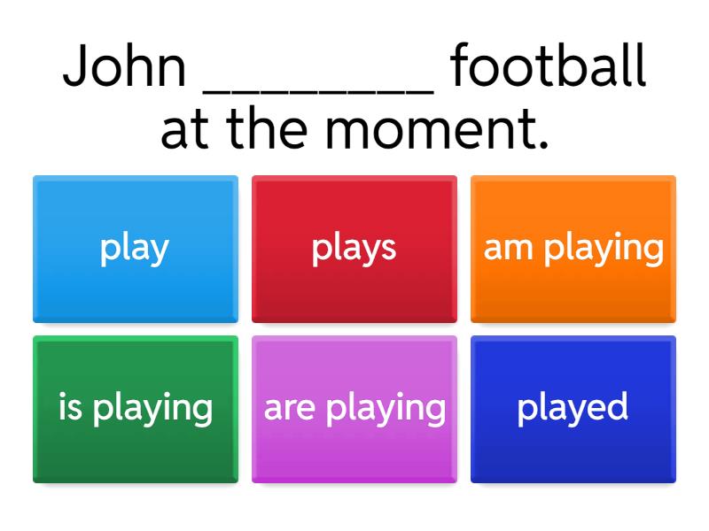 1) John ________ football at the moment. a) play b) plays c) am playing d) is playing e) are playing f) played 2) We often ___________ tests at our school. a) write b) am writing c) writes d) is writing e) are writing 3) I ____________ to my teacher now. a) are talking b) talks c) am talking d) talk e) is talking 4) Look! Mandy and Susan __________ a film on TV. a) watch b) is watching c) watching d) watchs e) are watching f) am watching 5) Olivia _____________ her uncle every weekend. a) is visitng b) visits c) are visiting d) visit e) am visiting 6) Miguel __________ to go out tonight. (not want) a) don´t want b) is wanting c) are wanting d) doesn't want e) want f) am wanting 7) _________________ pop music? (you/like) a) Are you liking b) Does you like c) Is you like d) Do you liking e) Are you like f) Do you like 8) Let's go home. I _________________ a good time (not have) a) am having b) doesn´t have c) am not having d) does have e) are having f) do have 9) We _________________ with our grandparents this weekend. (stay) a) doesn´t stay b) are staying c) stays d) is staying e) don´t stay f) stay 10) What time ______________ work? (your mum/usually/finish) a) your mum usually finishes b) is your mum usually finishing c) do your mum usually finish d) does your mum usually finish e) your mum usually are finishing f) do your mum usually finishes 11) We usually ________ to school. a) are walking b) is walking c) walks d) walk e) am walking f) walking 12) She ________ an orange at the moment. a) is eating b) eat c) don´t eat d) are eating e) doesn´t eating f) eats 13) Jeff ________ a story to her every night. a) are reading b) read c) reads d) is reading e) don´t read f) reading 14) She ________ to bed at about nine o'clock. a) is going b) are going c) go d) goes e) don´t goes f) don´t go 15) At the moment, Sue ________ in London. a) live b) is living c) lives d) doesn´t live e) are living f) lived