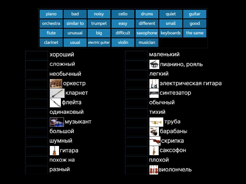 cello - виолончель, clarinet - кларнет, drums - барабаны, flute - флейта, guitar - гитара, keyboards - синтезатор, piano - пианино, рояль, saxophone - саксофон, trumpet - труба, violin - скрипка, electric guitar - электрическая гитара, musician - музыкант, orchestra - оркестр, big - большой, small - маленький, noisy - шумный, quiet - тихий, usual - обычный, unusual - необычный, good - хороший, bad - плохой, the same - одинаковый, different - разный, similar to - похож на , easy - легкий, difficult - сложный,