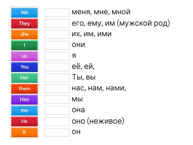 she - она, It - оно (неживое), He - он, We - мы, You - Ты, вы, They - они, I - я, Her - её, ей, , Him - его, ему, им (мужской род), them - их, им, ими, us - нас, нам, нами, , me - меня, мне, мной,
