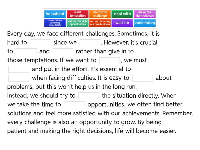 Every day, we face different challenges. Sometimes, it is hard to ____ since we ____. However, it's crucial to ____ and ____ rather than give in to those temptations. If we want to ____, we must ____ and put in the effort. It's essential to ____ when facing difficulties. It is easy to ____ about problems, but this won't help us in the long run. Instead, we should try to ____ the situation directly. When we take the time to ____ opportunities, we often find better solutions and feel more satisfied with our achievements. Remember, every challenge is also an opportunity to grow. By being patient and making the right decisions, life will become easier.