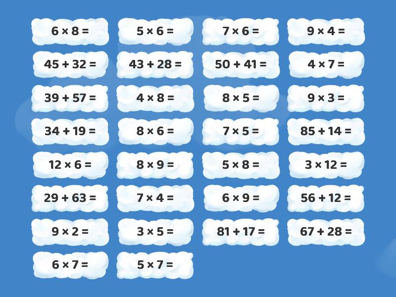 6 × 7 = - 42, 8 × 9 = - 72, 5 × 6 = - 30, 4 × 8 = - 32, 7 × 5 = - 35, 9 × 3 = - 27, 6 × 9 = - 54, 3 × 12 = - 36, 8 × 6 = - 48, 7 × 4 = - 28, 5 × 8 = - 40, 9 × 2 = - 18, 4 × 7 = - 28, 3 × 5 = - 15, 12 × 6 = - 72, 8 × 5 = - 40, 9 × 4 = - 36, 6 × 8 = - 48, 7 × 6 = - 42, 5 × 7 = - 35, 45 + 32 = - 77, 67 + 28 = - 95, 34 + 19 = - 53, 81 + 17 = - 98, 56 + 12 = - 68, 29 + 63 = - 92, 43 + 28 = - 71, 85 + 14 = - 99, 50 + 41 = - 91, 39 + 57 = - 96,