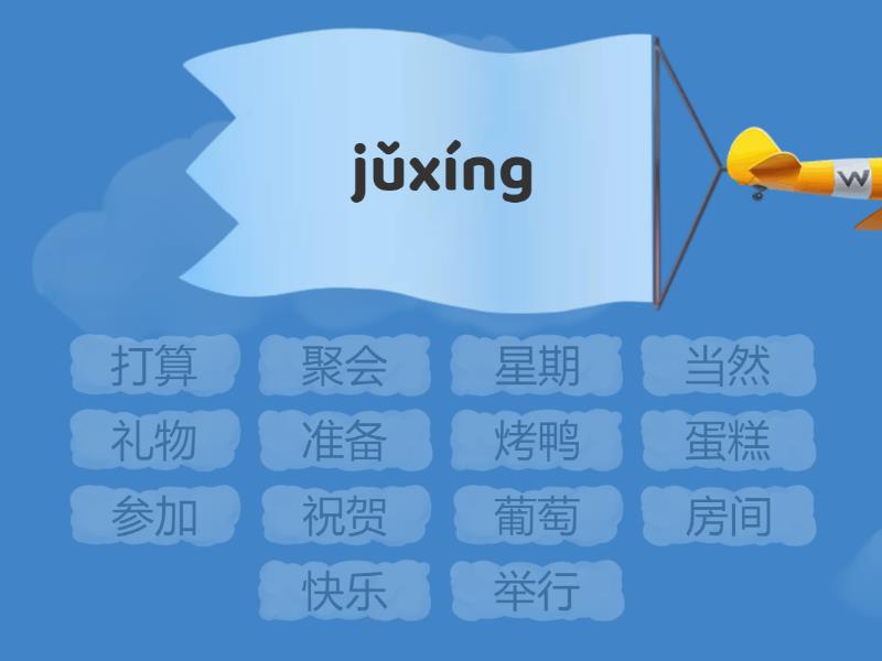举行 - jǔxíng, 参加 - cānjiā, 聚会 - jùhuì, 准备 - zhǔnbèi, 祝贺 - zhùhè, 快乐 - kuàilè, 房间 - fángjiān, 打算 - dǎsuàn, 烤鸭 - kǎoyā, 蛋糕 - dàngāo, 葡萄 - pútao, 星期 - xīngqī, 当然 - dāngrán, 礼物 - lǐwù,