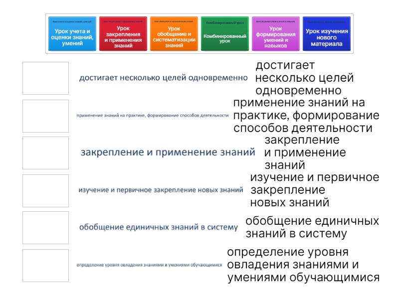 Урок изучения нового материала - изучение и первичное закрепление новых знаний, Урок закрепления и применения знаний - закрепление и применение знаний, Урок формирования умений и навыков - применение знаний на практике, формирование способов деятельности, Урок обобщение и систематизации знаний - обобщение единичных знаний в систему, Урок учета и оценки знаний, умений - определение уровня овладения знаниями и умениями обучающимися, Комбинированный урок - достигает несколько целей одновременно,