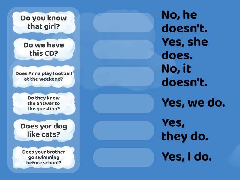Do you know that girl? - Yes, I do., Does your brother go swimming before school? - No, he doesn't., Do they know the answer to the question? - Yes, they do., Does Anna play football at the weekend? - Yes, she does., Does yor dog like cats? - No, it doesn't., Do we have this CD? - Yes, we do.,