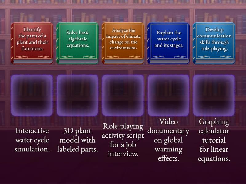 Identify the parts of a plant and their functions. - 3D plant model with labeled parts., Analyze the impact of climate change on the environment. - Video documentary on global warming effects., Solve basic algebraic equations. - Graphing calculator tutorial for linear equations., Develop communication skills through role-playing. - Role-playing activity script for a job interview., Explain the water cycle and its stages. - Interactive water cycle simulation.,