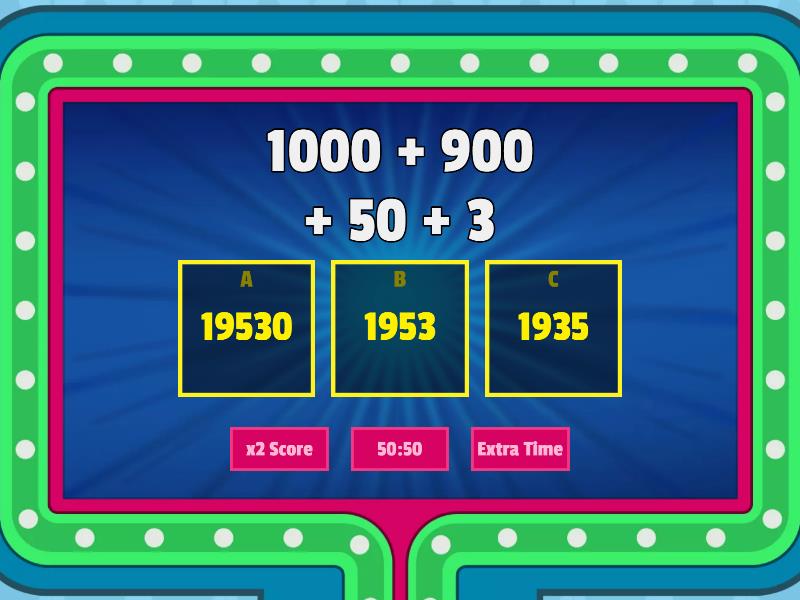 1) 1000 + 900 + 50 + 3 a) 19530 b) 1953 c) 1935 2) 2000 + 600 + 10 + 2 a) 2612 b) 26012 c) 261 3) 5 thousand six-hundred twenty a) 5602 b) 520 c) 5620 4) 5000 + 90 + 3 a) 53 b) 5093 c) 593 5) nine hundred and thirty-six a) 936 b) 9306 c) 9360 6) 4,560 a) 4 thousands b) 4 hundreds c) 4 tens 7) 1,000 + 4 a) 1,004 b) 4001 c) 14 8) one thousand twenty-two a) 102 b) 1,202 c) 1,022 9) Which digit is in the thousand position in the number 3,405 a) 4 b) 5 c) 3 d) 0 10) Which digit is in the hundred position in the number 3,405 a) 4 b) 5 c) 3 d) 0 11) Which digit is in the ten position in the number 3,405 a) 4 b) 5 c) 3 d) 0 12) Which digit is in the ones position in the number 3,405 a) 4 b) 5 c) 3 d) 0