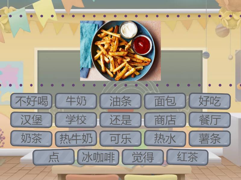 薯条, 面包,  牛奶, 觉得, 奶茶 , 可乐,  红茶, 点, 好吃, 不好喝, 冰咖啡, 热牛奶, 热水,  学校, 餐厅, 商店, 汉堡, 油条, 还是 - або - чи,