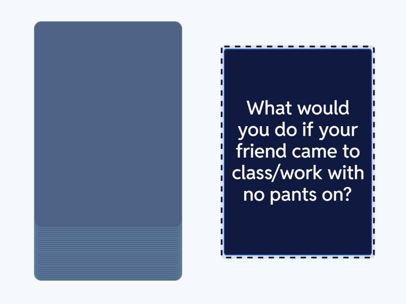 What would you do if you found a bag of cash on the street?, Where would you be right now if you could be anywhere?, Who would you marry if you could marry anyone right now?, What job would you do if all jobs paid the exact same amount of money?, What would you do if your friend came to class/work with no pants on?, How would you react if I told you there were a spider on your shoulder?, How would you die if you could choose?, What would you do if you heard someone saying bad things about your friend?, What would you say if someone asked you out on a date?, What would you do if someone pushed in front of you while you were waiting to be served at a cafe?, What would you do if the TV news wanted to interview you?, What would you do if you were the last person left on Earth?, What would you do if you saw someone crying on the street?, Where would you fly to if you had wings?, What would you do if you thought two of your friends would make a great couple?, What skill would you like to have if you could instantly receive it right now?, Who would you make disappear from history if you could?, Who would you be if you could be anyone?, What would you eat most often if every type of food were healthy?, If you could travel back in time, what time period would you visit and why?, If you could be any age for the rest of your life, what age would you choose and why?, If you could switch lives with one person for a day, who would it be and why?, If you could meet any person in history, who would it be and why?, If you could live in any country in the world, where would you choose?, If you could have any job in the world, what would it be?, If you could have any animal as a pet what would it be?, If you could speak any language fluently, which one would you choose?, If you could change one thing about the world, what would it be?, If you could only eat one type of food for the rest of your life, what would it be?.