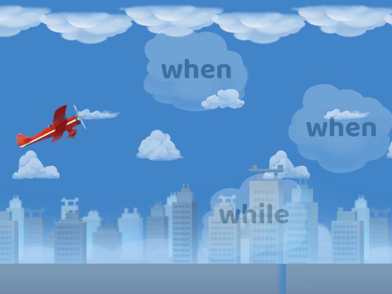 1) I was listening to music............you called me. a) when b) while 2) My dog was barking ..............the postman arrived. a) when b) while 3) ...............Henry came, his children were sleeping. a) when b) while 4) .............Fiona met Shrek, he was living in a swamp. a) when b) while 5) ..............I saw you, you were laughing. a) when b) while 6) We were having a picnic...........it started to rain. a) when b) while 7) The mouse got in ..................the cat was sleeping. a) when b) while 8) The shark attached the man ...............he was swimming. a) when b) while 9) They saw the kangaroo................they were driving. a) when b) while 10) ........it was snowing, I cleaned the driveway. a) when b) while 11) .......... they were playing card, the pizza guy rang. a) when b) while 12) .............Sarah was running, her shoelace got untied. a) when b) while
