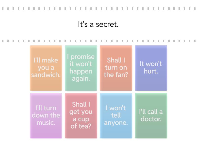I won't tell anyone. - It's a secret., Shall I get you a cup of tea? - It's very cold., I'll make you a sandwich. - I'm hungry., I'll call a doctor. - I don't feel well., I'll turn down the music. - I need to study., It won't hurt. - I'm scared of injections., I promise it won't happen again. - You're late again., Shall I turn on the fan? - It's really hot today.,