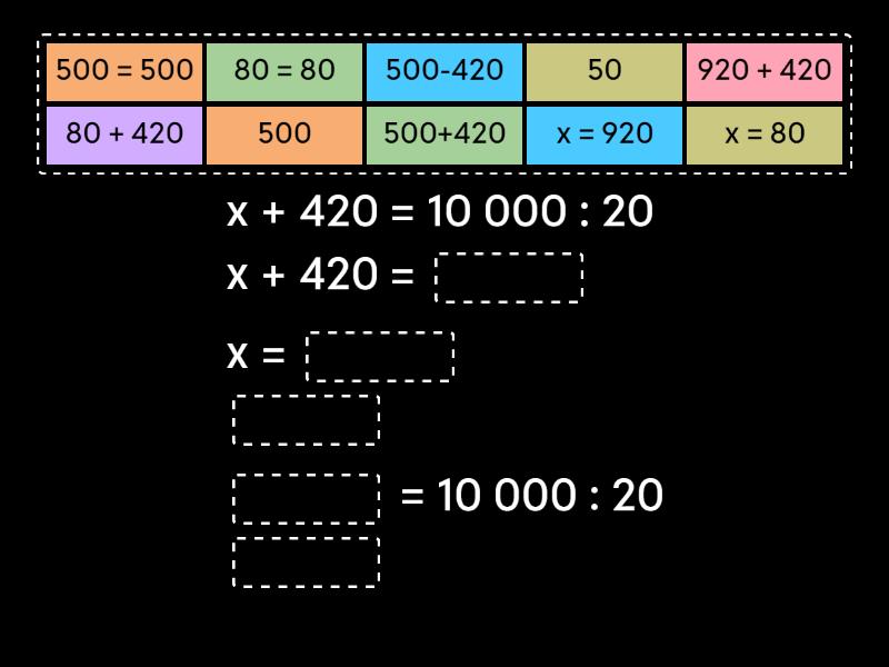 х + 420 = 10 000 : 20 х + 420 = ____ х = ____ ____ ____ = 10 000 : 20 ____ 1200 – у = 45 ∙ 4 ____ = ____ у = ____ у = ____ ____ = 45 ∙ 4 180 = 180 330 ∙ 2 + с = 1000 ____ = 1000 с = ____ ____ 330 ∙ 2 + ____ = 1000 1000 = 1000 а – (125 + 475) = 850 ____ = 850 а = ____ ____ ____ – (125 + 475) = 850 850 = 850