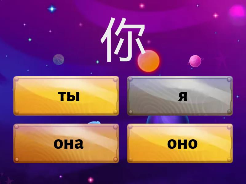 1) 你 a) ты b) я c) она d) оно 2) 我 a) мое b) он c) я d) наш 3) 他 a) вы b) она c) он d) они 4) 她 a) он b) их c) оно d) она 5) 他们 a) они b) мы c) их d) ваш 6) 我们 a) мы b) я c) нащ d) вы 7) 你们 a) мы b) они c) вы d) ваш