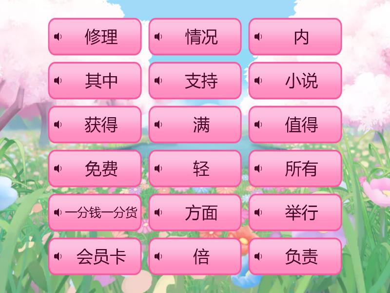 轻 - qīng ,adj. légère, 方面 - fāng miàn, n.aspect, 值得 - zhí dé, v. mériter, 内 - nèi , à l'intérieur, 负责 - fù zé , v. se charger, 免费 - miǎn fèi, adj. graduit, 修理 - xiū lǐ , v.réparer, 倍 - bèi , n. fois, 一分钱一分货 - yī fēn qián yī fēn huò = On en a pour son argent., 支持 - zhī chí ,v.soutenir / n.soutien, 举行 - jǔ xíng, v. tenir/avoir lieu, 满 - mǎn, v. arriver à terme; / adv.complètement, 其中 - qí zhōng, n. parmi, entre, 小说 - xiǎo shuō, n. roman, 会员卡 - huì yuán kǎ, n.carte de fidélité, 所有 - suǒ yǒu, adj. tout, 获得 - huò dé, v.gagner, 情况 - qíng kuàng, n.situation,