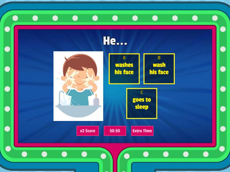 1) He... a) washes his face b) wash his face c) goes to sleep 2) He... a) brush his teeth b) brushes his teeth c) does his homework 3) She... a) gets up b) gets dressed c) get dressed 4) She... a) watches homework b) watch TV c) watches TV 5) He... a) go to sleep b) goes to sleep c) goes to school 6) He... a) goes home b) go to school c) goes to school 7) They a) goes home b) go home c) goes to sleep 8) She... a) has a shower b) have a shower c) washes her face 9) He... a) do his homework b) does his homework c) goes to school 10) He... a) goes to school b) get dressed c) gets dressed