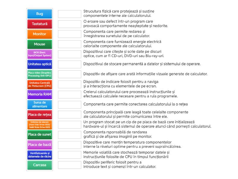 Bug - O eroare sau defect într-un program care provoacă comportamente neașteptate și nedorite., Unitatea Centrală de Prelucrare (CPU) - Creierul calculatorului care procesează instrucțiunile și efectuează calculele necesare pentru a rula programele., Memoria RAM - Memorie volatilă care stochează temporar datele și instrucțiunile folosite de CPU în timpul funcționării , Placa de bază - Componenta principală care leagă toate celelalte componente ale calculatorului și permite comunicarea între ele., Unitatea de stocare (Hard Disk Drive-HDD/ Solid State Drive-SSD) - Dispozitivul de stocare permanentă a datelor și sistemului de operare. , Placa video (Graphics Processing Unit-GPU) - Componenta rsponsabilă de randarea grafică și de afișarea imaginii pe monitor., Sursa de alimentare - Componenta care furnizează energie electrică celorlalte componente ale calculatorului., Carcasa - Strucutura fizică care protejează și susține componentele interne ale calculatorului., Monitor - Dispozitiv de afișare care arată informațiile vizuale generate de calculator., Tastatură - Dispozitiv periferic folosit pentru a introduce text și comenzi într-un calculator., Mouse - Dispozitiv de indicare folosit pentru a naviga și a interacționa cu elementele de pe ecran., Unitatea optică - Dispozitivul care citește și scrie date pe discuri optice, cum ar fi CD-uri, DVD-uri sau Blu-ray-uri., Placa de sunet - Componenta care permite redarea și înregistrarea sunetului de pe calculator., Placa de rețea - Componenta care permite conectarea calculatorului la o rețea, Ventilatoarele și sistemele de răcire - Dispozitive care mențin temperatura componentelor interne la niveluri optime pentru a preveni supraîncălzirea., BIOS (Basic Input/Output System) - Un program stocat pe un cip de pe placa de bază care inițializează hardware-ul și încarcă sistemul de operare atunci când pornești calculatorul.,