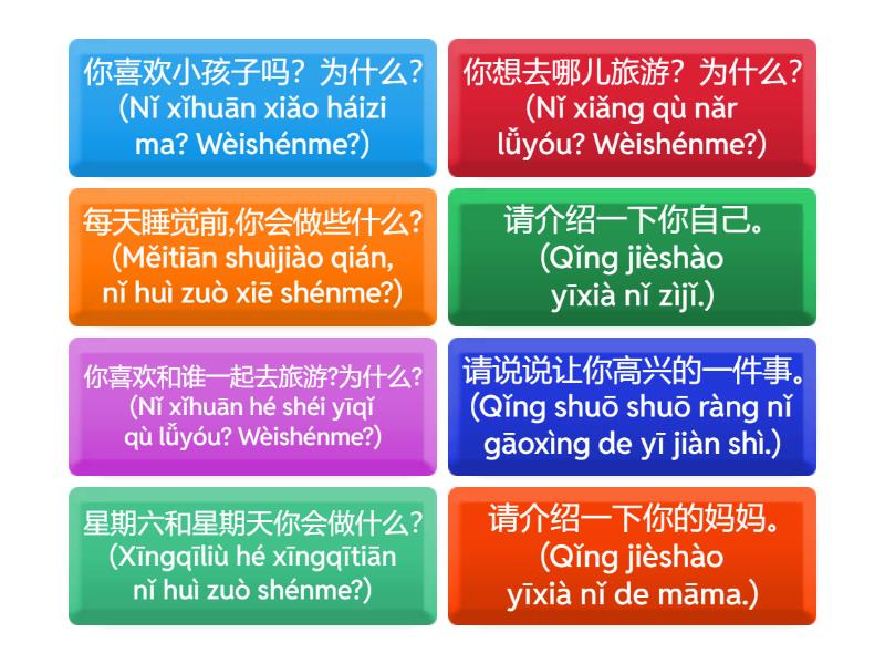 每天睡觉前,你会做些什么? (Měitiān shuìjiào qián, nǐ huì zuò xiē shénme?), 你喜欢和谁一起去旅游?为什么? (Nǐ xǐhuān hé shéi yīqǐ qù lǚyóu? Wèishénme?), 请介绍一下你自己。 (Qǐng jièshào yīxià nǐ zìjǐ.), 你想去哪儿旅游?为什么? (Nǐ xiǎng qù nǎr lǚyóu? Wèishénme?), 星期六和星期天你会做什么? (Xīngqīliù hé xīngqītiān nǐ huì zuò shénme?), 你喜欢小孩子吗?为什么? (Nǐ xǐhuān xiǎo háizi ma? Wèishénme?), 请介绍一下你的妈妈。 (Qǐng jièshào yīxià nǐ de māma.), 请说说让你高兴的一件事。 (Qǐng shuō shuō ràng nǐ gāoxìng de yī jiàn shì.),
