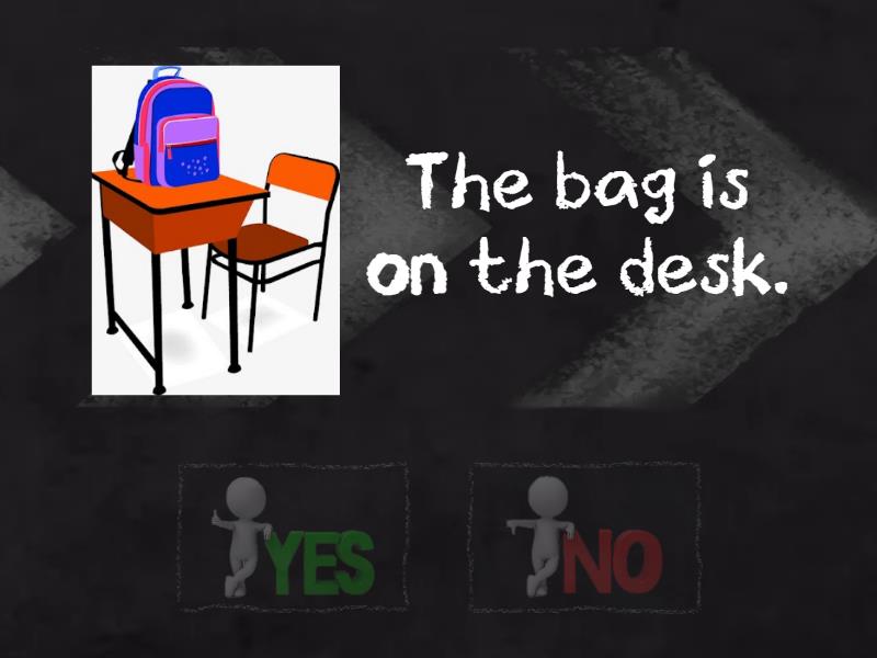 : The bag is on the desk., The rubber is next to the pencil case., The book is on the chair., The mouse is under the hat., The cat is in the car., The pencil is next to the pen., The goat is in the tree., The phone is on the chair, : The bag is under the desk., The rubber is on the pencil case., The book is in the chair., The mouse is on the hat., The cat is next to the car., The pencil is on the pen., The goat is under the tree., The phone is under the chair,