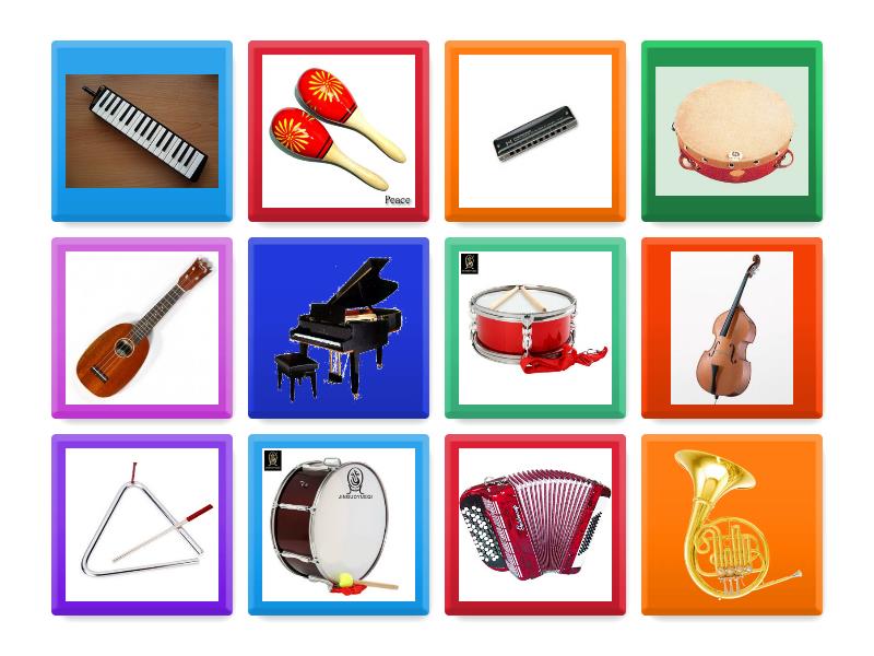 鈴鼓, 法國號, 提琴, 口風琴, 鋼琴, 沙鈴, 手風琴, 烏克麗麗, 大鼓, 小鼓, 三角鐵, 口琴,
