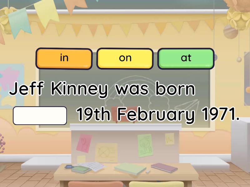 Jeff Kinney was born ____ 19th February 1971. Kinney is ____ Maryland, USA His book, Diary of a Wimpy Kid, is read ____ 70,000 children every day! In college, he wrote ____ the school newspaper. Kinney moved ____ Massachusetts in 1997. He enjoys spending time ____ his two children. Federico can play the guitar as ____ as the piano. The film was ____ funny, wasn't it? We need to leave ____ or we will be late! She ate everything! She ____ ate the vegetables!