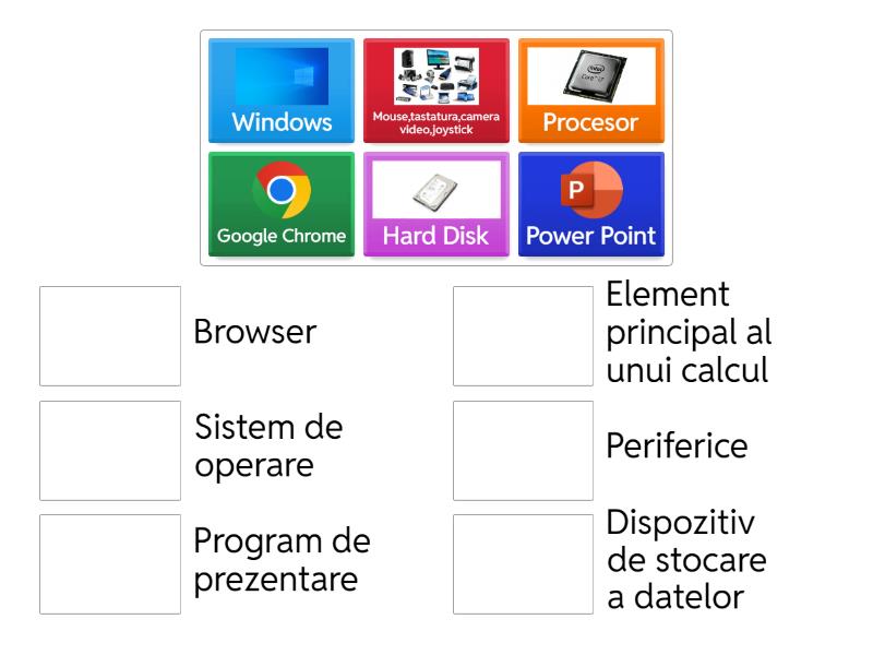 Windows - Sistem de operare, Power Point - Program de prezentare , Google Chrome - Browser, Mouse,tastatura,camera video,joystick - Periferice , Hard Disk - Dispozitiv de stocare a datelor, Procesor - Element principal al unui calcul,