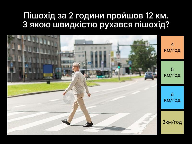 1) Пішохід за 2 години пройшов 12 км. З якою швидкістю рухався пішохід? a) 4 км/год b) 5 км/год c) 6 км/год d) 3км/год 2) Автомобіль рухався зі швидкістю 65 км/год і був у дорозі 3 год. Яку відстань подолав автомобіль за цей час? a) 185км b) 195км c) 190км d) 205км 3) Поїзд проїхав до зупинки 180км, рухаючисьзі швидкістю 90 км/год. Скільки часу поїзд їхав до зупинки? a) 3 год b) 4год c) 2год d) 5год 4) Турист 2 години рухався пішки зі швидкістю 4 км/год, а потім 4 години їхав автобусом зі швидкістю 70км/год. Яку відстань подолав турист за цей час? a) 280км b) 320км c) 288км d) 32км 5) Яка площа шкільного саду прямокутної форми, якщо його довжина 12м, а ширина 4м? a) 32 м² b) 38 м² c) 48 м² d) 60 м² 6) В першому автобусі їхало а пасажирів, а в другому - в 3 рази менше. Скільки пасажирів було в 2 автобусах разом? a) а+2 b) а+а:3 c) а*3+а d) а-а:3 7) Чому дорівнює значення Х в даному рівнянні 320:8+Х=12*5 a) Х= 20 b) Х=40 c) Х=60 d) Х=12 8) 120*30= a) 1200 b) 300 c) 360 d) 3600
