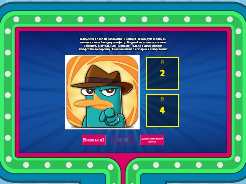 1) Фокусник в 5 шляп разложил 18 конфет. В каждую шляпу он положил хотя бы одну конфету. В одной из шляп оказалось 5 конфет. В остальных - меньше. Только в двух шляпах конфет было поровну. Сколько шляп с четырьмя конфетами? a) 2 b) 4 2) В классе 20 учеников. Из них только футболом занимаются 7, и футболом, и шахматами - 3, только шахматами - 6. Сколько учеников не занимается ни футболом, ни шахматами? a) 7 b) 4 3) 1 апельсин = 2 сливы. Сколько слив нужно добавить на правую чашу, чтобы весы пришли в равновесие? a) 6 b) 4 c) 2 d) 3 4) Ане и Ване 2 года назад вместе было 15 лет. Сейчас Ане 13 лет. Сколько должно пройти лет, чтобы Ване исполнилось 9 лет? a) 3 b) 4 c) 2 d) 5 5) Найди закономерность, продолжи ряд чисел. a) 18 b) 16 c) 19 d) 21