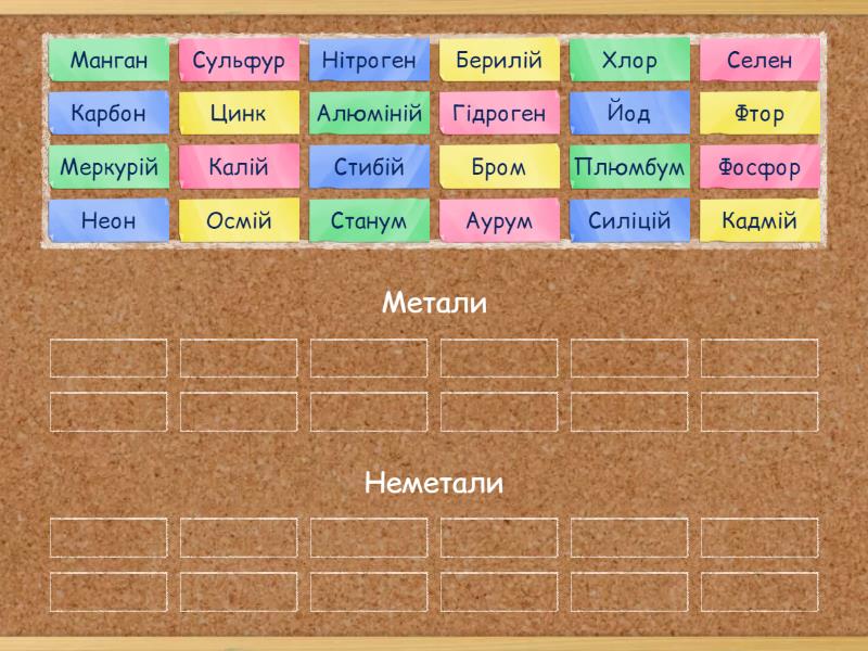 Метали: Алюміній, Берилій, Цинк, Калій, Плюмбум, Станум, Манган, Аурум, Меркурій, Стибій, Кадмій, Осмій, Неметали: Сульфур, Неон, Хлор, Йод, Карбон, Силіцій, Нітроген, Селен, Фосфор, Бром, Фтор, Гідроген,