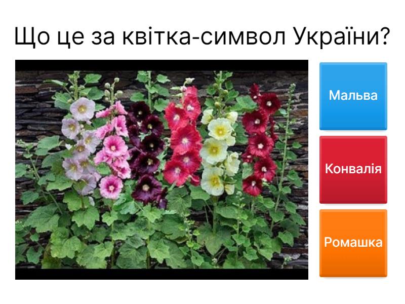 1) Що це за квітка-символ України? a) Мальва b) Конвалія c) Ромашка 2) Яку назву має це дерево? a) Верба b) Береза c) Липа 3) Що це за квітка-символ України? a) Фіалка b) Соняшник c) Ромашка 4) Як називається ця рослина? a) Дзвоники b) Колоски пшениці c) Колоски жита 5) Як називають цього птаха? a) Чапля b) Чайка c) Лелека 6) Яку назву має це дерево? a) Дуб b) Клен c) Тополя 7) Що це за квітка-символ України? a) Гіацинт b) Чоргобривці c) Тюльпан 8) Як називається традиційний український одяг? a) Мотанка b) Писанка c) Вишиванка 9) Що це за квітка-символ України? a) Волошка b) Барвінок c) Айстра 10) Як називаються великодні яйця? a) Вишиванка b) Писанка c) Кіндер 11) Як називають цю ляльку-оберіг? a) Вишиванка b) Писанка c) Мотанка 12) Хто ця загадкова пташка? a) Соловейко b) Зозуля c) Сорока