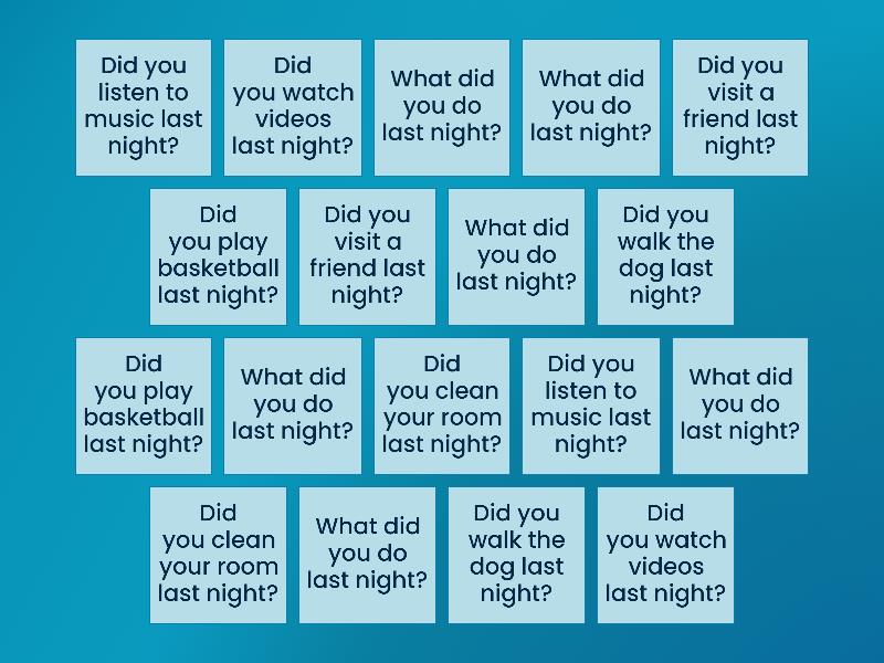 What did you do last night? - I cleaned my room last night., What did you do last night? - I listened to music last night., What did you do last night? - I played basketball last night., What did you do last night? - I walked the dog last night., What did you do last night? - I watched videos last night., What did you do last night? - I visited a friend last night., Did you play basketball last night? - Yes, I did., Did you play basketball last night? - No, I didn't. I walked the dog last night., Did you clean your room last night? - Yes, I did., Did you clean your room last night? - No, I didn't. I listened to music last night., Did you listen to music last night? - Yes, I did., Did you listen to music last night? - No, I didn't. I played basketball last night., Did you walk the dog last night? - Yes, I did., Did you walk the dog last night? - No, I didn't. I watched videos last night., Did you watch videos last night? - Yes, I did., Did you watch videos last night? - No, I didn't. I visited a friend last night., Did you visit a friend last night? - Yes, I did., Did you visit a friend last night? - No, I didn't. I cleaned my room last night.,