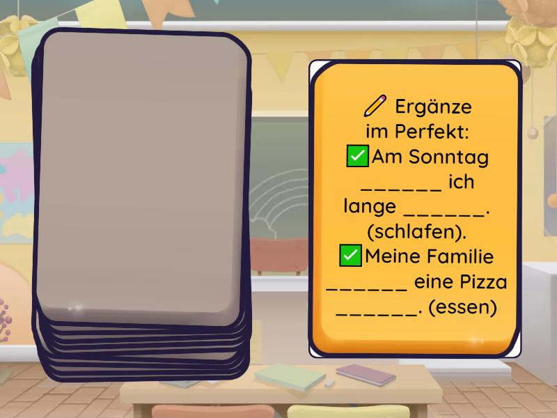 Was machst du morgens vor der Schule? Beschreibe deine Morgenroutine., ✏️ Ergänze im Perfekt: ✅Am Sonntag ______ ich lange ______. (schlafen). ✅Meine Familie ______ eine Pizza ______. (essen), Ich bleibe zu Hause, weil …, Was darfst du nicht zu Hause machen?, Wohin willst du in den Ferien fahren?, Bilde einen Satz: zu Hause / ich / bleibe / weil / müde / ich / bin, Richtig oder falsch? ➡️ Ich habe Fußball gespielt gestern., Was vergisst du manchmal?, Beschreibe das Bild ☺️, 🎯 Dein Freund macht die Tür nicht zu. 👉 Sag ihm etwas!.