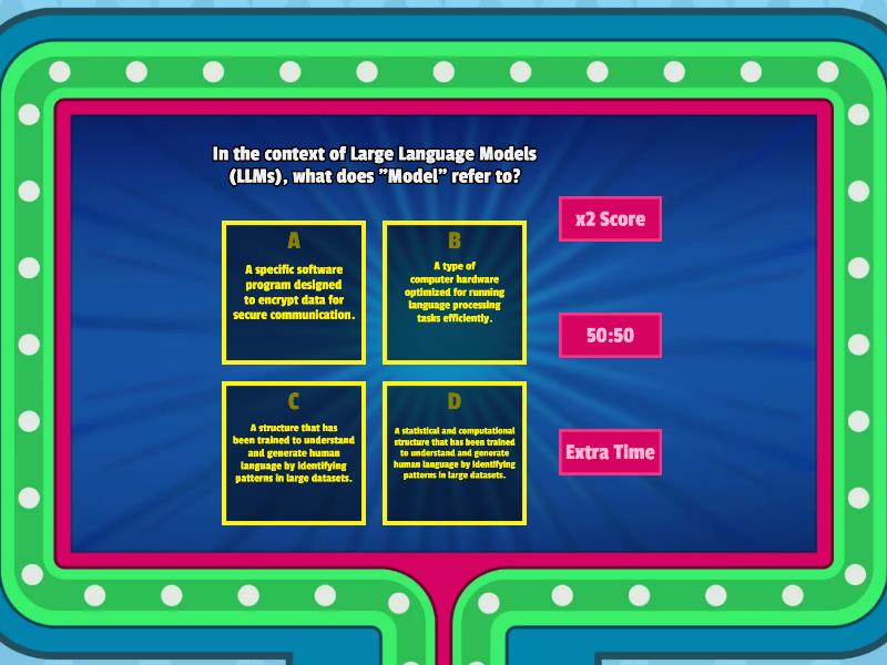 1) In the context of Large Language Models (LLMs), what does "Model" refer to? a) A specific software program designed to encrypt data for secure communication. b) A type of computer hardware optimized for running language processing tasks efficiently. c) A structure that has been trained to understand and generate human language by identifying patterns in large datasets. d) A statistical and computational structure that has been trained to understand and generate human language by identifying patterns in large datasets. 2) What are the differences between Large Language Models (LLMs)? a) Variations in their ability to encrypt data for cybersecurity purposes. b) Their underlying architectures, training data size, and optimization for specific tasks such as text generation or comprehension. c) The types of physical media they require for data installation and distribution. d) Their capability to generate visual content like images and videos for multimedia applications. 3) Which statement best summarizes the factors for choosing and LLM? a) Finding the LLM that has the lowest cost of hardware installation and maintenance. b) Considering the LLM that has the highest number of developers working on it worldwide. c) Selecting the LLM that best matches the visual scheme of your project. d) Evaluating the LLM based on its strengths in specific tasks, availability of resources, and suitability to data and use case requirements. 4) True or False? Once an LLM is developed, it is available to everyone. a) True b) False 5) How many LLMs are there currently?  a) Around 100 b) Around 1,000 c) Around 10,000 d) Unknown