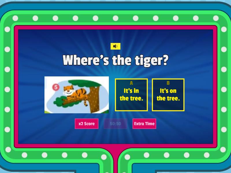 1) Where's the tiger? a) It's in the tree. b) It's on the tree. 2) Where's the bear? a) The bear is is the lake. b) The bear is in the river. 3) Where's the penguin? a) It's on the rock. b) It's under the rock. 4) Where's the kangaroo? a) The kangaroo is under the tree. b) The kangaroo is in the tree. 5) Where's the tiger? a) The tiger is in the tree. b) The tiger is on the tree. 6) Where's the monkey? a) It's on the rock. b) It's under the rock. 7) Where's the penguin? a) It's under the hill. b) It's under the rock. 8) Where's the bear? a) The bear is in the river. b) The bear is in the lake. 9) Where's the monkey? a) The tiger is in the tree. b) The monkey is in the tree. 10) Where's the tiger? a) The tiger is under the rock. b) The tiger is on the rock. 11) Where's the bear? a) It's under the rock. b) It's on the rock. 12) Where's the tiger? a) It's in the tree. b) It's under the tree.