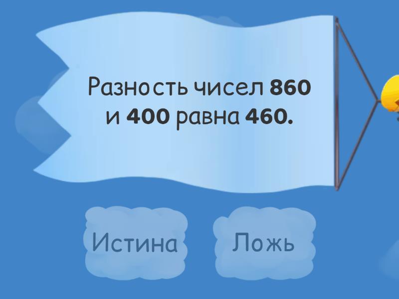 Истина: Разность чисел 860 и 400 равна 460., Число 600 меньше, чем 700, на 100., Сумма чисел 170 и 300 равна 470., Число 400 больше, чем 300, на 1 сотню., Уменьшаемое 9 сотен, вычитаемое 3 сотни, разность 600, 8 сотен больше, чем 3 десятка, на 770., Ложь: Если число 340 увеличить на 20, то получится 520., Если число 980 уменьшить на 30, то получится 650., Если вместо вопроса равенства ? + 60 = 400 поставить число 240, то оно станет верным., Произведение чисел 7 и 8 равно 57,