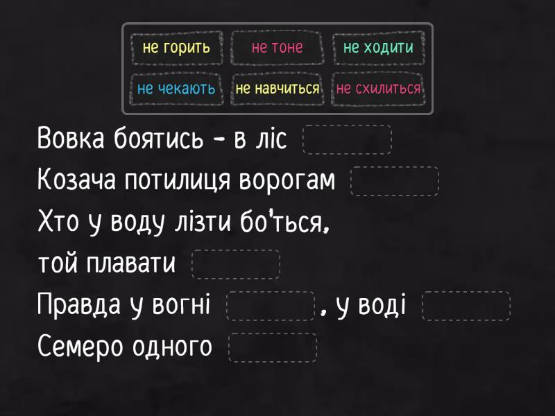 Вовка боятись - в ліс ____ Козача потилиця ворогам ____ Хто у воду лізти бо'ться, той плавати ____ Правда у вогні ____, у воді ____ Семеро одного ____