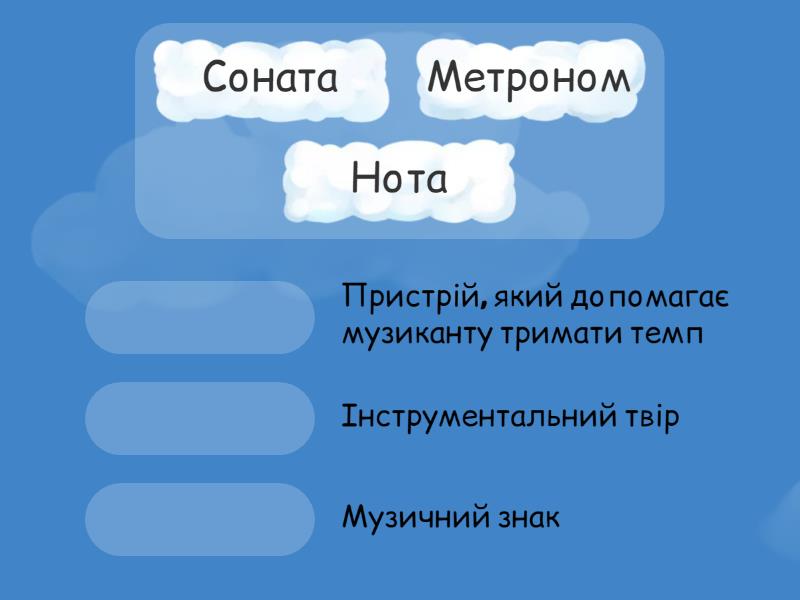 Нота - Музичний знак, Метроном - Пристрій, який допомагає музиканту тримати темп, Соната - Інструментальний твір,