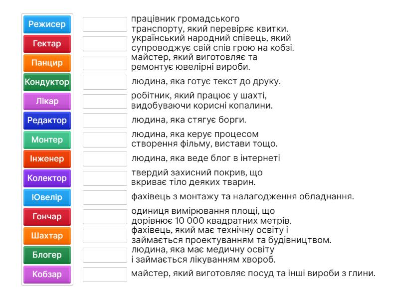 Лікар - людина, яка має медичну освіту і займається лікуванням хвороб., Шахтар - робітник, який працює у шахті, видобуваючи корисні копалини., Кобзар - український народний співець, який супроводжує свій спів грою на кобзі., Інженер - фахівець, який має технічну освіту і займається проектуванням та будівництвом., Ювелір - майстер, який виготовляє та ремонтує ювелірні вироби., Панцир - твердий захисний покрив, що вкриває тіло деяких тварин., Гектар - одиниця вимірювання площі, що дорівнює 10 000 квадратних метрів., Монтер - фахівець з монтажу та налагодження обладнання., Блогер - людина, яка веде блог в інтернеті, Гончар - майстер, який виготовляє посуд та інші вироби з глини., Режисер - людина, яка керує процесом створення фільму, вистави тощо., Колектор - людина, яка стягує борги., Кондуктор - працівник громадського транспорту, який перевіряє квитки., Редактор - людина, яка готує текст до друку.,